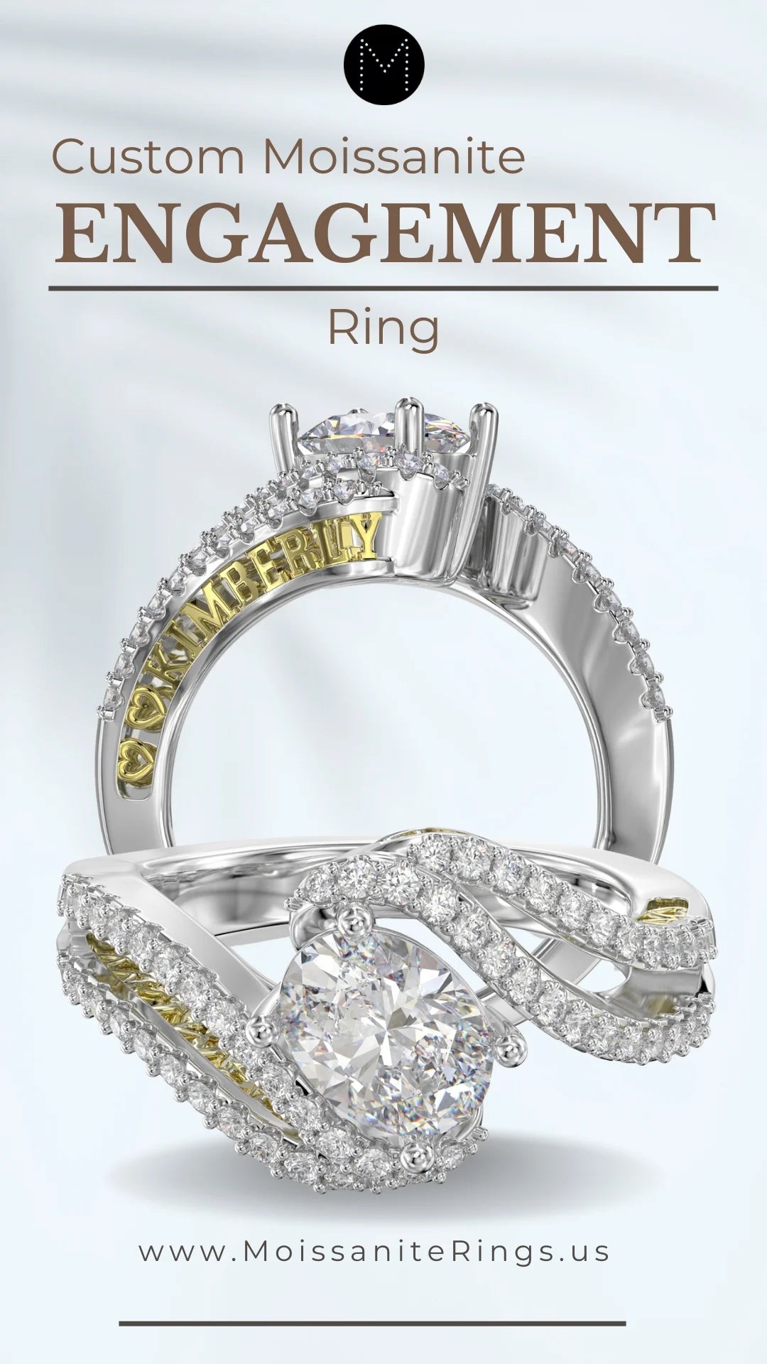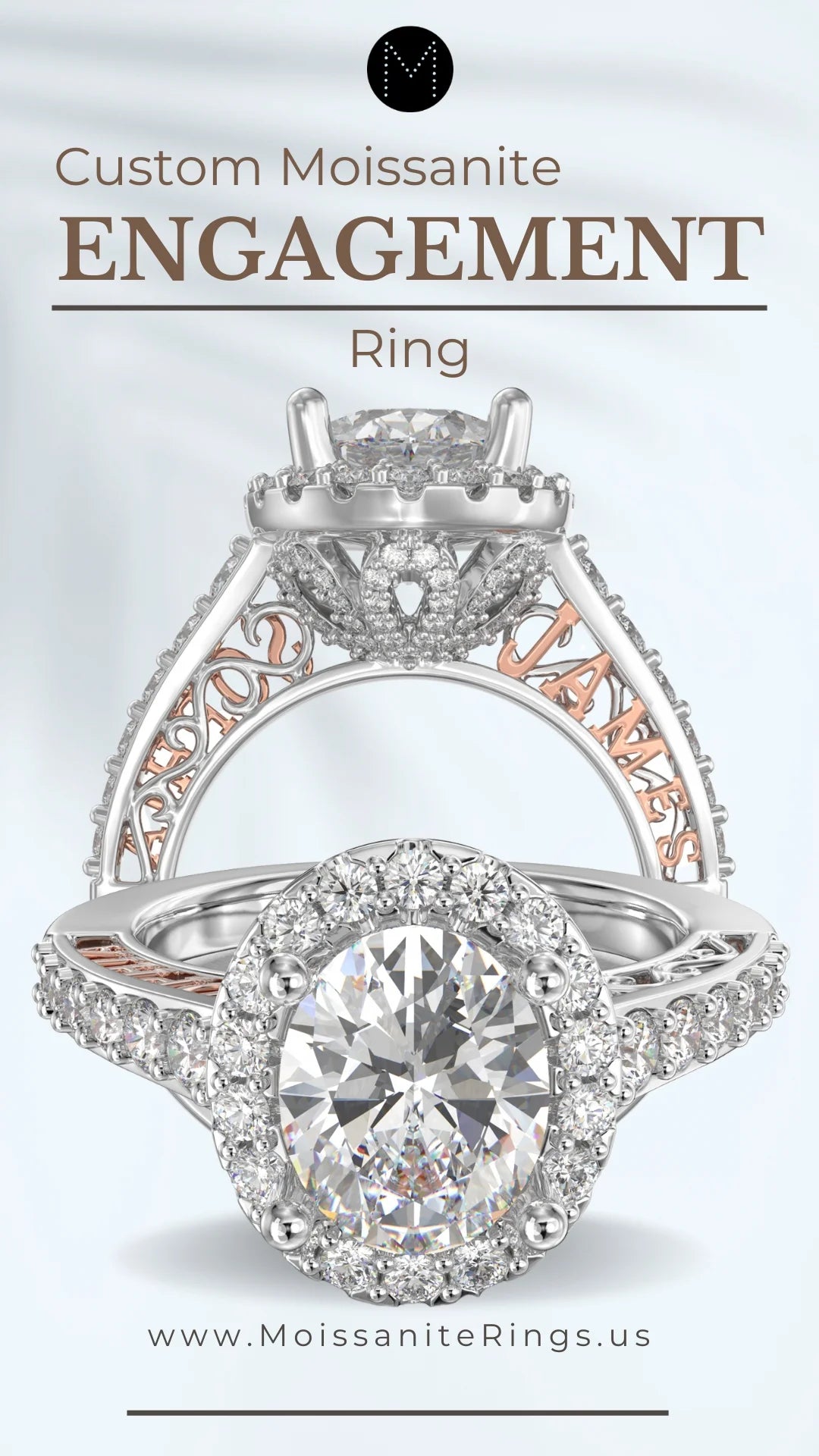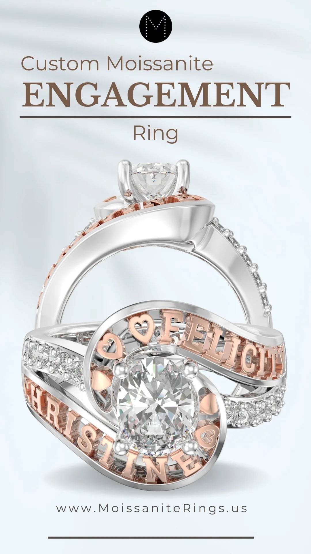 This custom engagement ring features a stunning 3-carat oval moissanite as the centerpiece. Moissanite is a diamond alternative known for its exceptional brilliance and fire. The 8x10mm oval-shaped moissanite has a color grade of D, which is the highest grade available and means it has a colorless appearance, similar to a diamond. The moissanite is set in a custom white gold band that includes two rose gold initials of your choice, adding a personal touch to the moissanite ring.