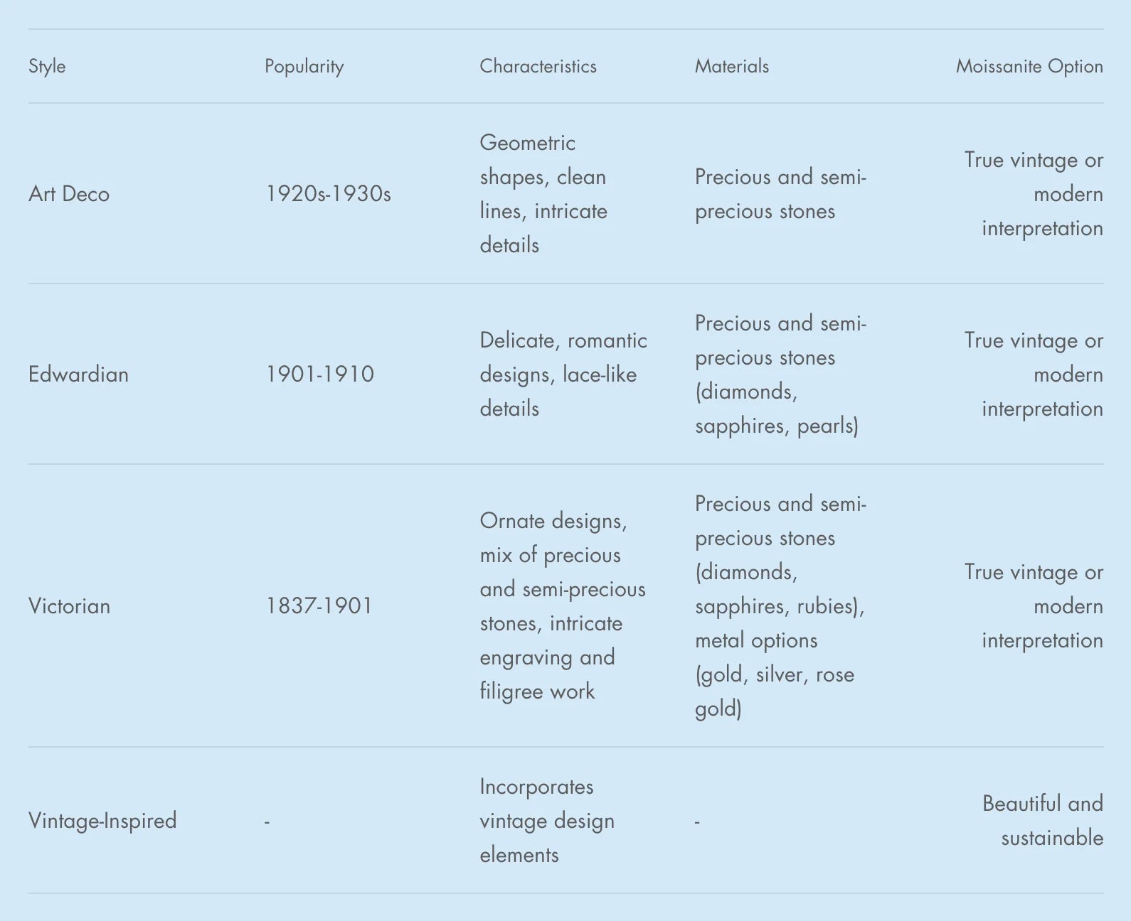 Vintage-inspired moissanite engagement rings are a unique and stylish option that incorporates vintage design elements while still offering the benefits of a modern moissanite ring. These rings can be designed in various vintage styles such as Art Deco, Edwardian, and Victorian, each of which has unique characteristics and design elements. By choosing a vintage-inspired moissanite engagement ring, you can be confident that you are getting a beautiful and sustainable ring.