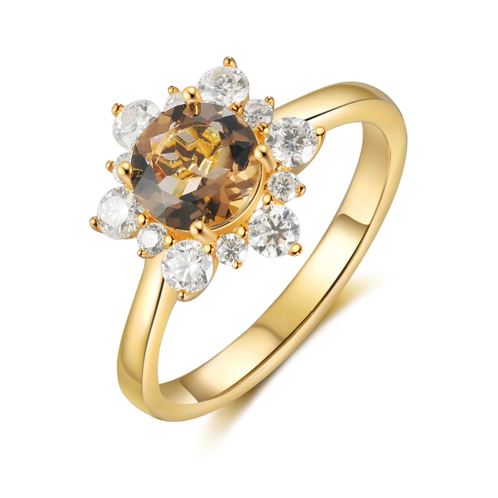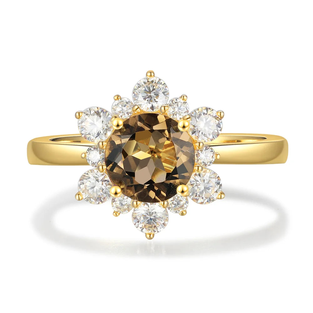 Surrounding the Smoky Quartz are six 2.6x2.6mm Moissanite gems and six 1.6x1.6mm Moissanite gems. Moissanite is a lab-created gemstone known for its exceptional brilliance and fire. These smaller Moissanites add extra sparkle and shine to the ring, making it truly mesmerizing.