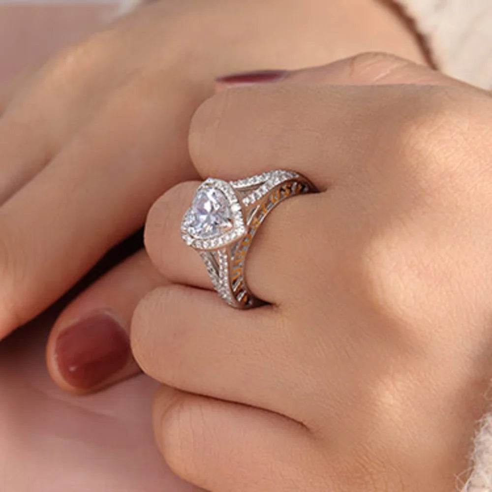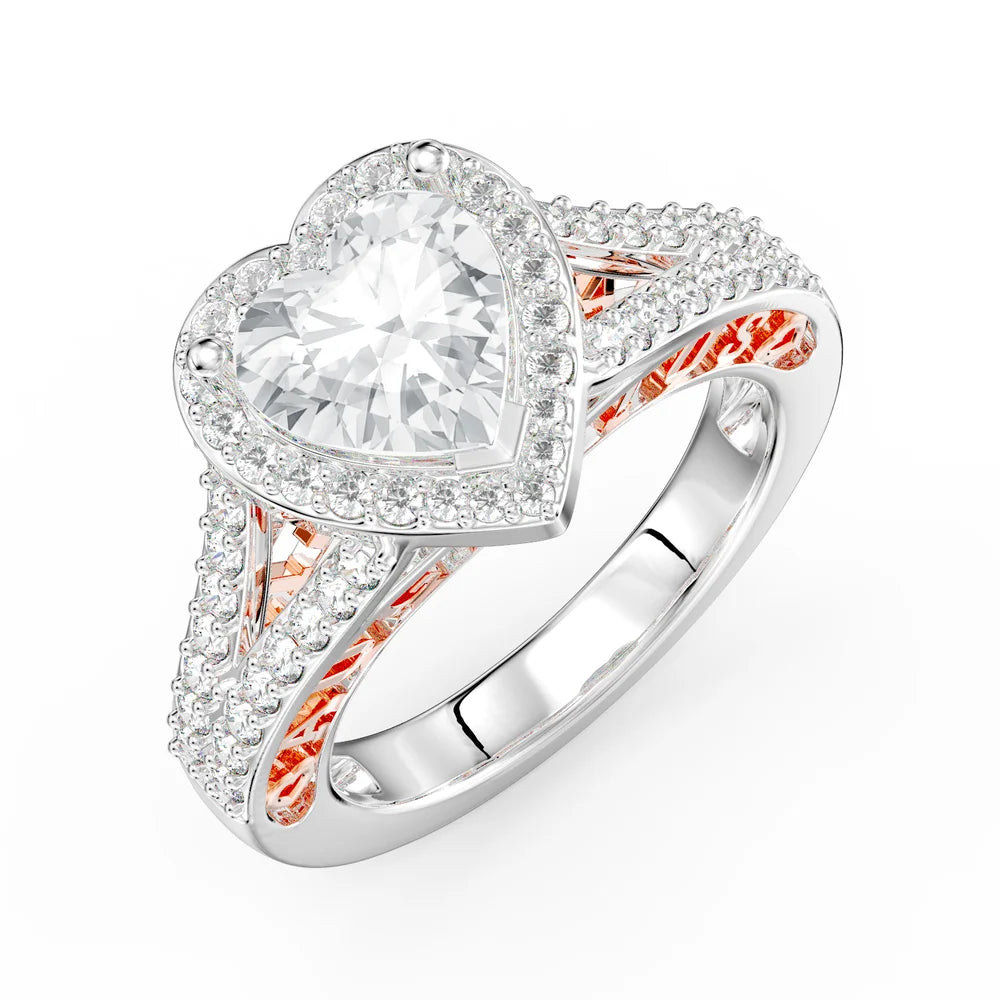 This beautiful 2-carat heart-cut moissanite engagement ring is perfect for the romantic and sentimental bride. The sparkling moissanite stone, with a color grade of D, is set on a 925 sterling silver band and is available in either 14K or 18K white or rose gold. The band can also be customized with two custom rose gold names and two birthstones, making this ring truly one of a kind.