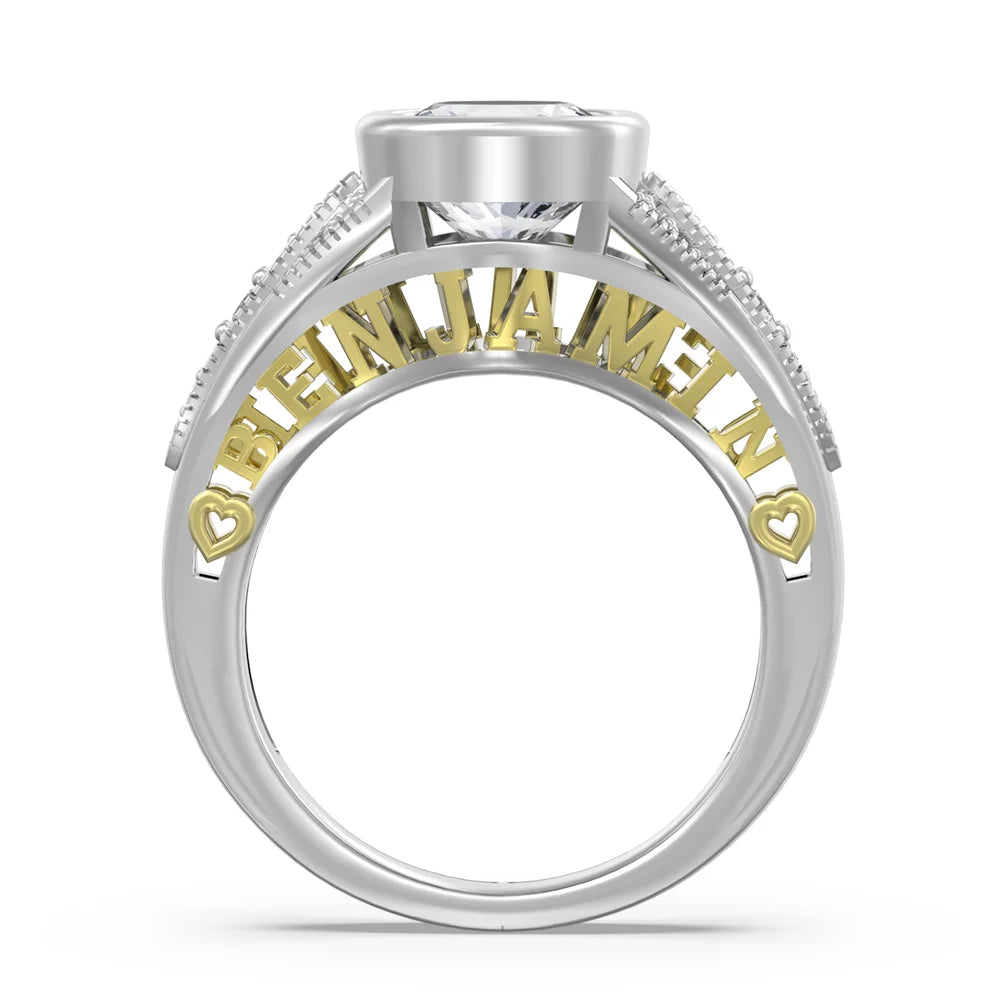 The 2.5 Carat Moissanite Ring With 2 Custom Names is the perfect way to show your loved one how much they mean to you. The stunning center stone will sparkle and shine, catching the eye of everyone who sees it. The custom names on either side of the ring make it even more special, as they are a reminder of your love and commitment to each other. Choose from 925 silver, 14K gold, or 18K gold to make this ring truly your own.