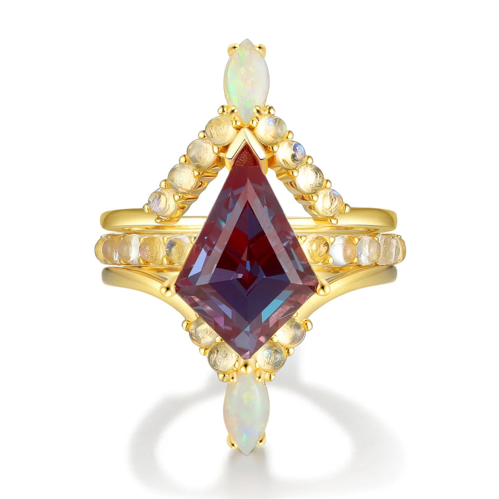 In conclusion, this Alexandrite engagement ring set with Opal and Moonstone is a perfect choice for anyone looking for a classic, vintage-inspired piece of jewelry. The combination of the Alexandrite, Opals, and beautifully crafted setting creates a breathtaking piece of jewelry that will surely be treasured for a lifetime. Whether you are looking for an Alexandrite wedding band or a beautiful piece of jewelry, this ring will meet your needs.