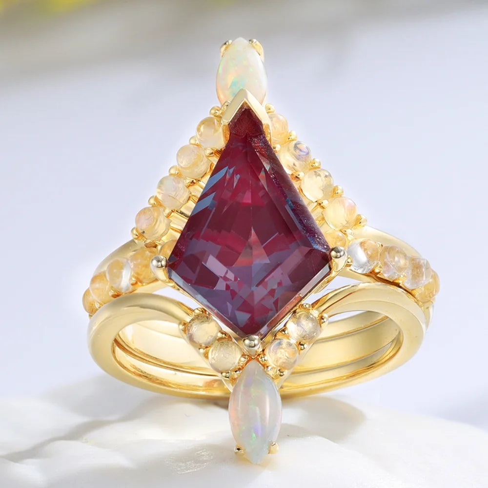 This set is a perfect choice for those looking for a vintage-inspired Alexandrite wedding ring. The combination of the color-changing Alexandrite and the Opals, along with the elegant setting, creates a timeless look that will never go out of style. Whether you are looking for an engagement ring, a wedding band, or a beautiful piece of jewelry, this Alexandrite gold ring will meet your needs.