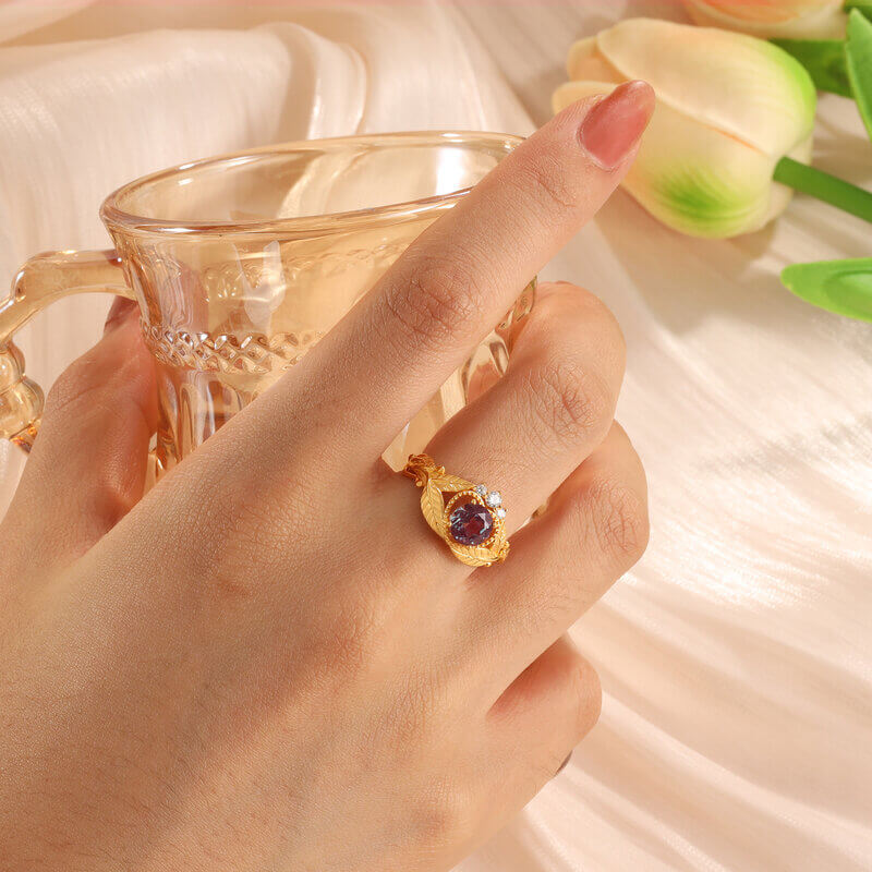 Elevate your jewelry collection with this stunning natural Alexandrite ring, featuring a beautiful round cut and sparkling moissanite accents. This ring is a true statement piece that complements any style. It is available in three exquisite materials, including 925 sterling silver with 18K yellow gold plating, 14K yellow gold, and 18K yellow gold.